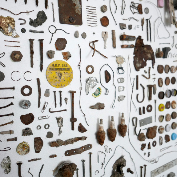 Installation d'objets et matières métalliques trouvés avec un détecteur dans le jardin du Bastion 14, chantier avec Florian Jan